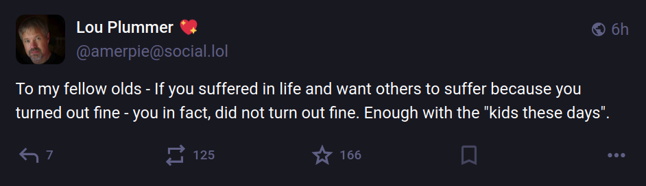 To my fellow olds - If you suffered in life and want others to suffer because you turned out fine - you in fact, did not turn out fine. Enough with the “kids these days”.