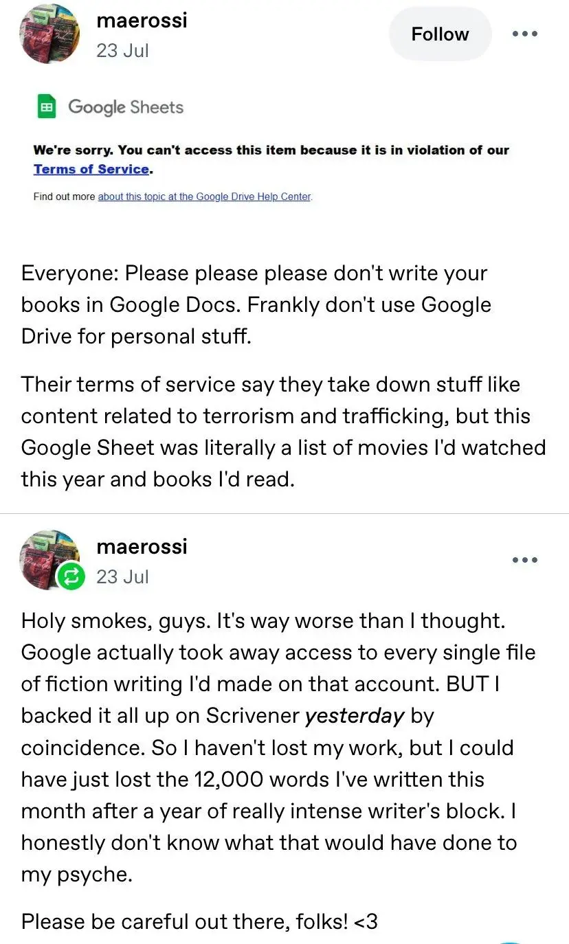 The only time in my life I’ve seriously considered suicide was when I lost the usb drive that had all my novel notes on it. If a major company ripped everything from me because “reasons”, I’d be considering homicide instead.