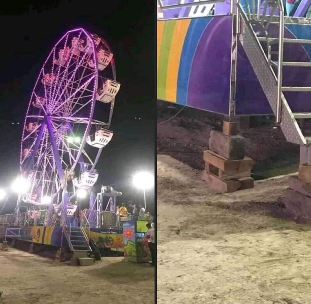 Because you’re presented with a photo of a ferries wheel that is installed in apparently uneven terrain. It’s highly questionable just how compacted that dirt actually is, seeing as nobody even bothered flattening it in the first place, so what do you wager are the chances of one of those massive outrigs you claim are under there sinking or slipping, putting a bunch of load on the structure, and causing it to fail violently?