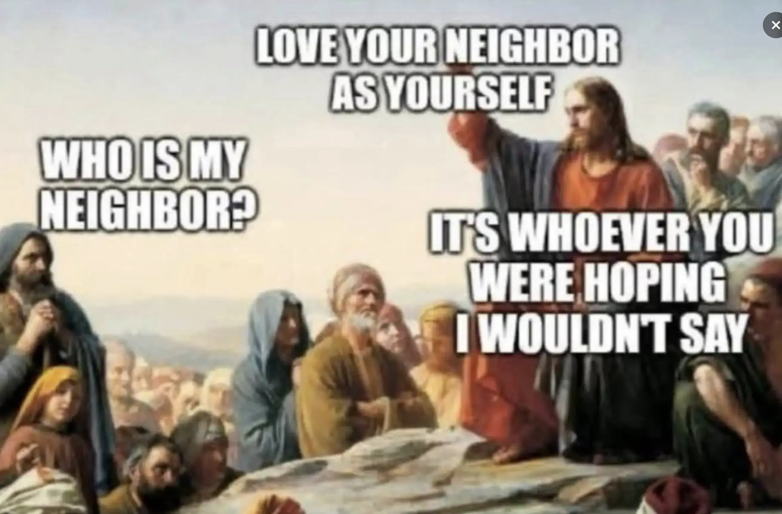 Picture of Jesus preaching “Love Your Neighbor as Yourself” and captioned with someone asking, “Who is my neighbor?”, and Jesus replying, “It’s whoever you’re hoping I wouldn’t say.”