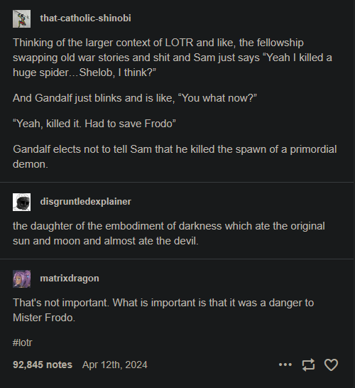 Imagine being a creature born of an ever yawning abyss, living for eons; and possibly the second mortal to evade your maw is not Beren, greatest of men, but rather Samwise, the humblest of the children of Ilúvatar, and not only did he evade her grasp, he wounded her and stole her finest meal in what was probably hundreds of years. Sam was truly one of the most valiant souls to ever walk Arda