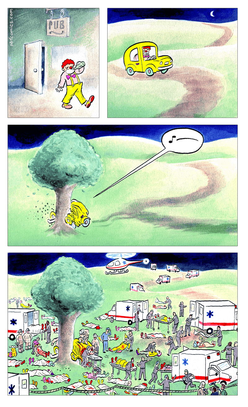 I figured out that there’s a clown who crashes his car into a tree because he is drunk, but I don’t get the last panel. Why are there suddenly so many bodies?