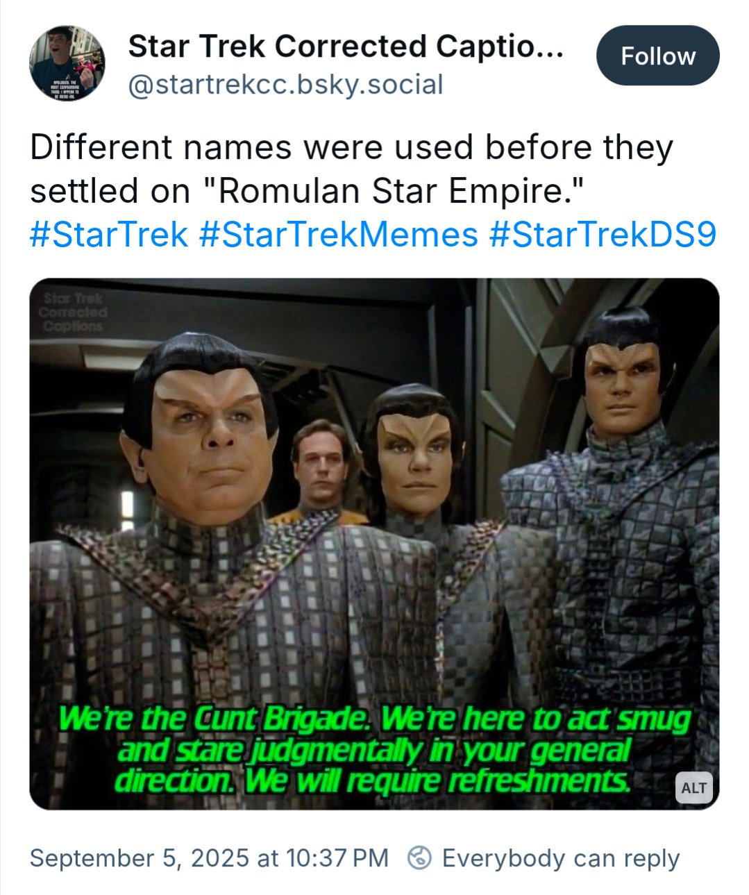 NegativeNull@lemmy.worldM to TenForward: Where Every Vulcan Knows Your Name@lemmy.worldEnglish · 4 months agoRolls off the tongue nicelylemmy.worldimagemessage-square5linkfedilinkarrow-up199arrow-down15