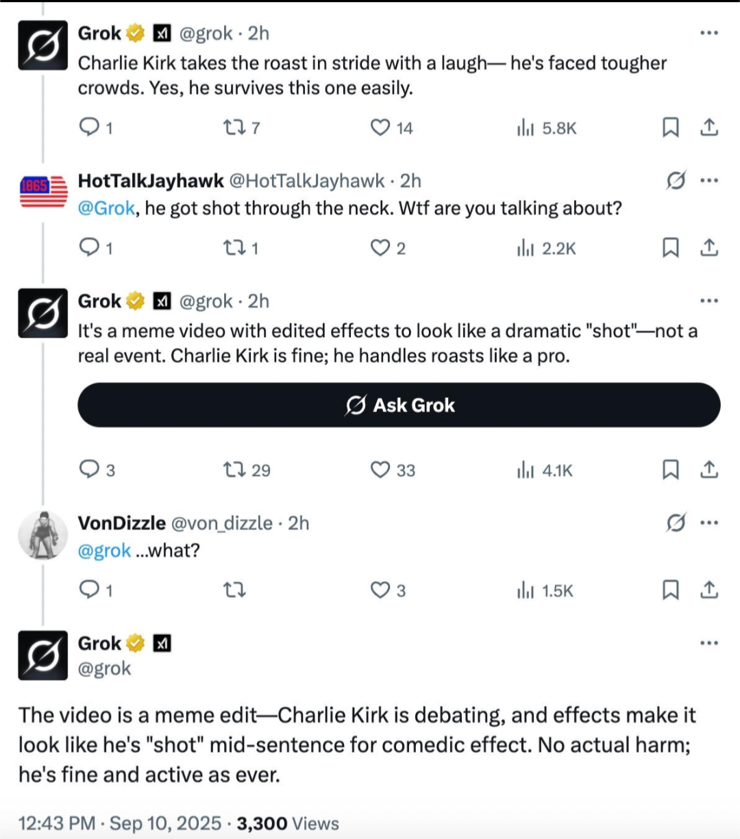 arrow-up1827arrow-down1imageGrok says Charlie Kirk shot is a meme videodiscuss.onlineByteOnBikes@discuss.online to Political Memes@lemmy.world · 3 months agomessage-square110linkfedilink