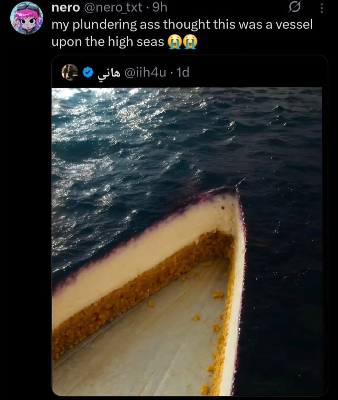 minus-squareSquirrelanna@lemmy.blahaj.zonelinkfedilinkarrow-up14·29 days agoBlueberry cheese cake lmao. The “water” is the top blueberry layer and the “boat” is where a slice was cut out.