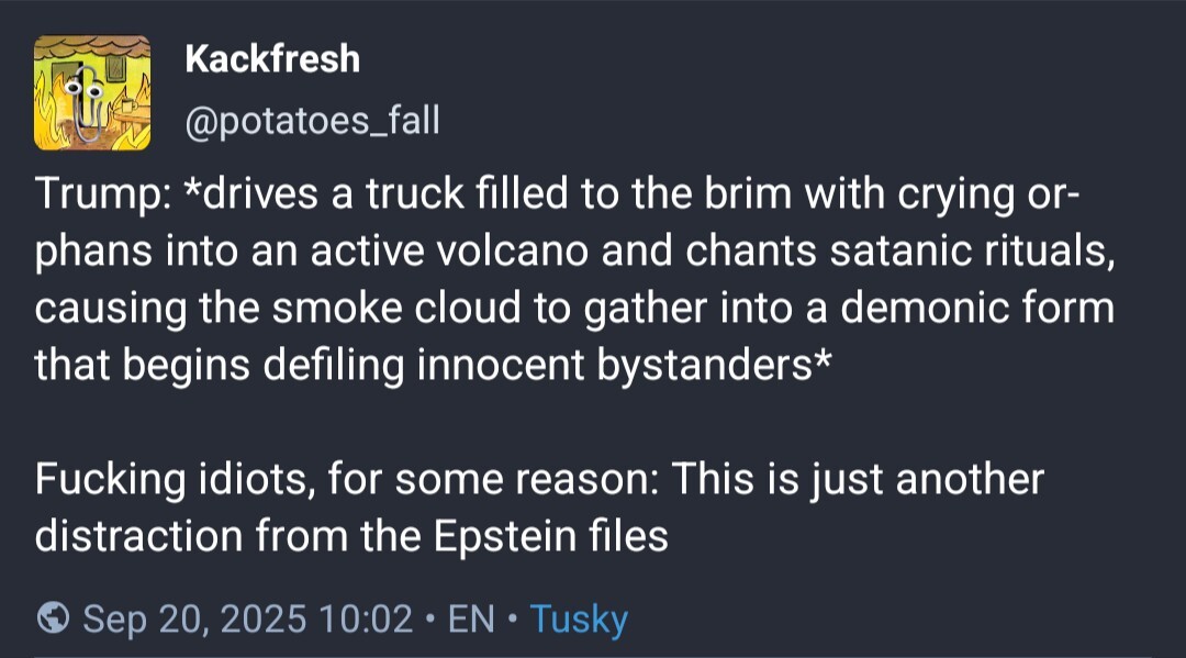 The Epstein files are a dead end; if MAGA was going to turn on Trump because of them they already would have. It’s more than possible for the sane half (more realistically ~60%) of America to stop the fascists, but it won’t happen if you keep waiting for the fascists to turn on their great leader because that just does not and will not happen.