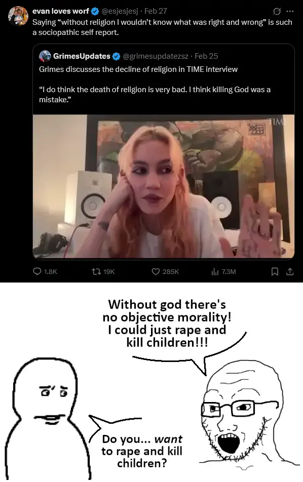 But let’s go less icky - most people don’t want to molest kids. So let’s talk about stealing. What is keeping me from stealing from a big corpo like Walmart? Security cameras and laws. What is keeping me from stealing from my neighbors, and even other people at large? I respect other humans enough to not take the things that they have paid for. No security cameras, police aren’t around - I could go take my neighbors nice lawn mower out of his shed tonight and likely never get caught, but I don’t because I don’t want to deprive another human of things they worked hard to acquire.