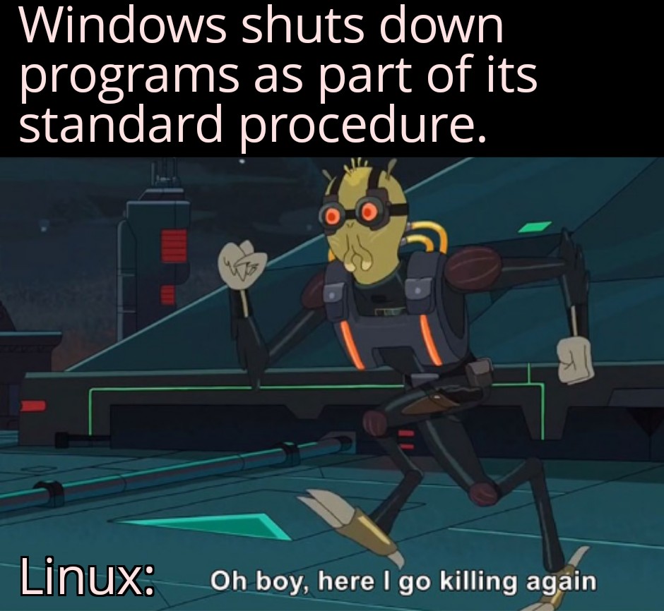 This is blatantly false, 99% of Gnu/Linux distros actually have systemd nicely asking the processes to terminate themselves, it just doesn’t take longer than ~10 seconds usually.