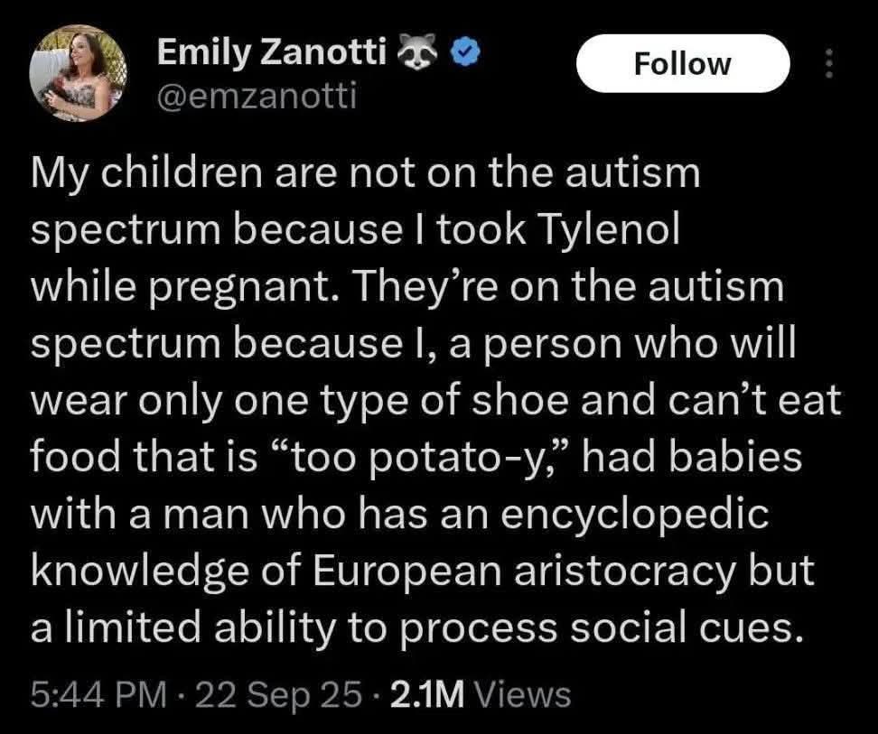 Edit: As with everything dear President does, Tylenol is 99% a distraction. RELEASE THE TRUMP-EPSTEIN-BARR FILES!