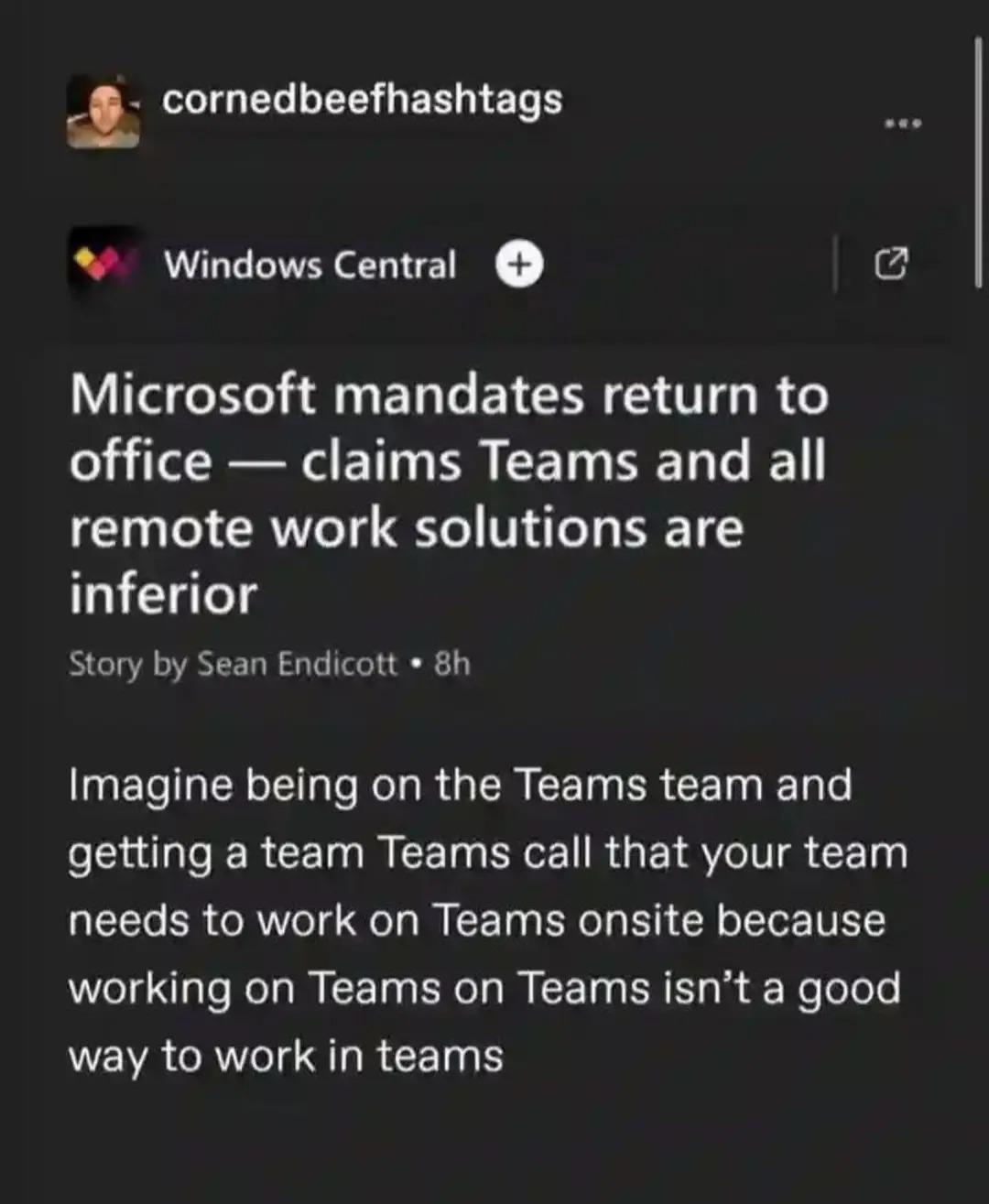 So now half of us are in the office, walking around, away from our computers and “collaborating” like management wants, to the absolute exclusion of the other half of the team. And we miss messages, we don’t see reminders, we are just AWAY on Teams to them. And our job is literally done 100% on a computer so all that time NOT on a computer is just wasted. And then when we go to a meeting, we have to walk to a room just to join a teams call and yell at the ceiling so the remote people can hear us. It’s the worse of both worlds. Not remote, not all in office, but mixed.