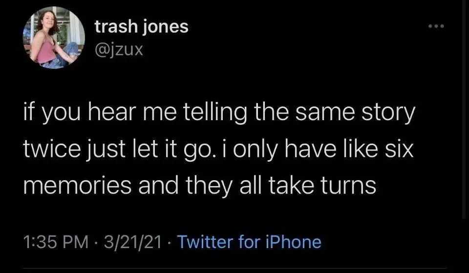 I don’t remember telling “anyone” the story, so I get excited I have a relevant story to tell, and they interrupt me 2 sentences in saying they have heard it before, which breaks my excitement and I get sad my memory is shit.