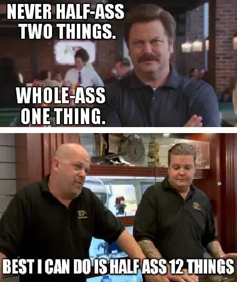 Half ass everything and then that’s your standard, then once in a while you whole ass something so you look amazing at your job, then back to half assing again, gotta keep that status quo.