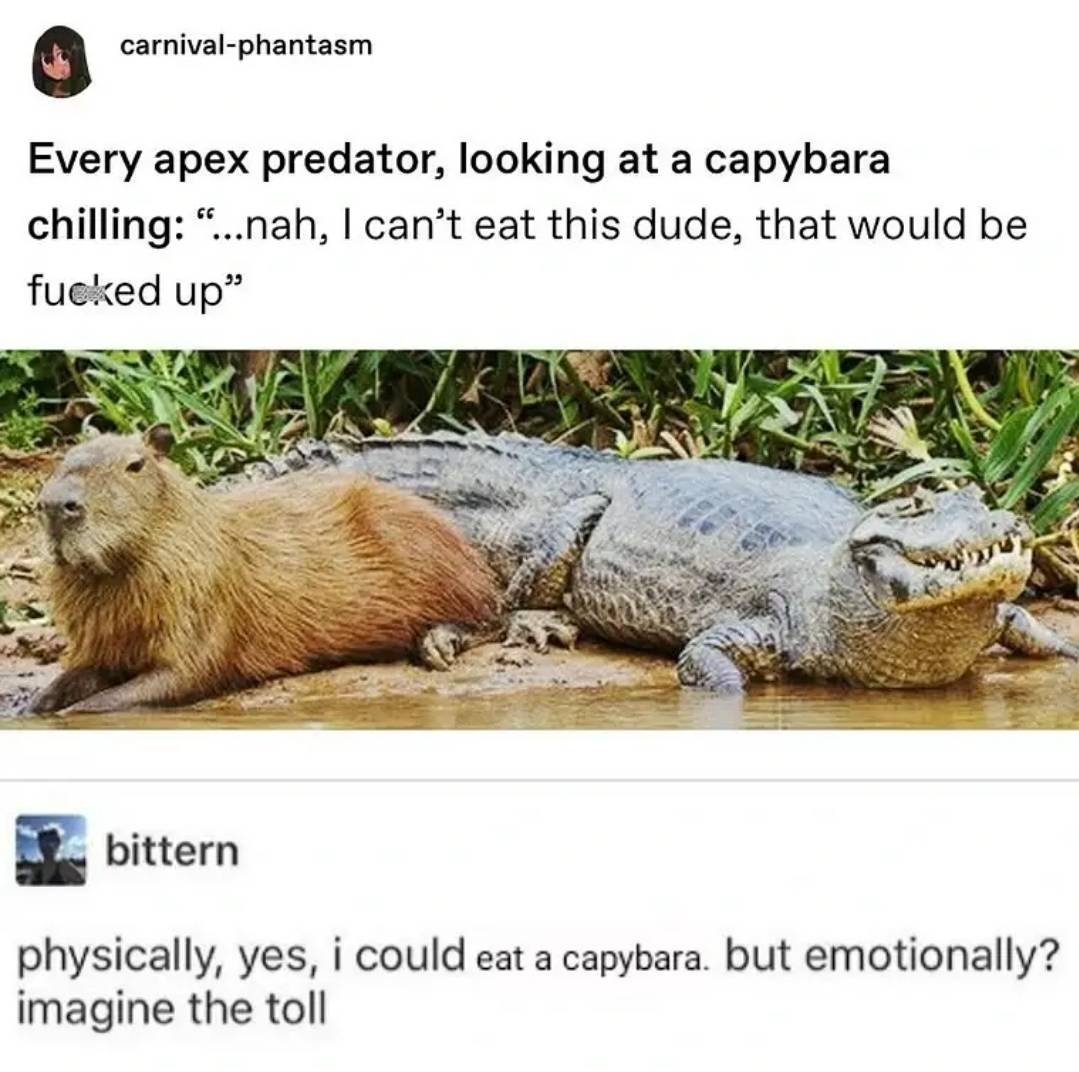 Hot take: eating a capybara is about as morally reprehensible as eating pasture-raised chicken.