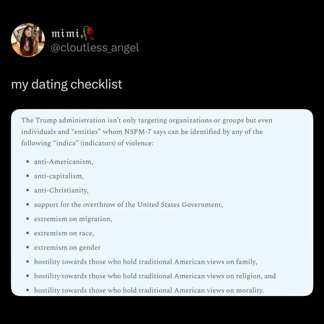 They think they do, but they keep the wording vague in their official statements because these rules are not to preserve American culture or their way of life, it’s all vibe based. I don’t like you so let’s see which of these vague statements I can attach to you so that you get in trouble that you literally cannot afford to get out of…