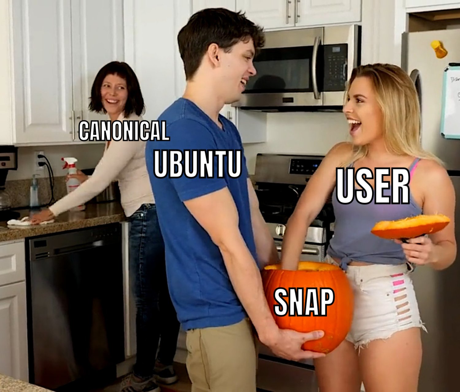 Maybe it would make more sense if the guy was the user and the girl was snap? Or the pumpkin was Ubuntu? Idk I can’t make it make sense.