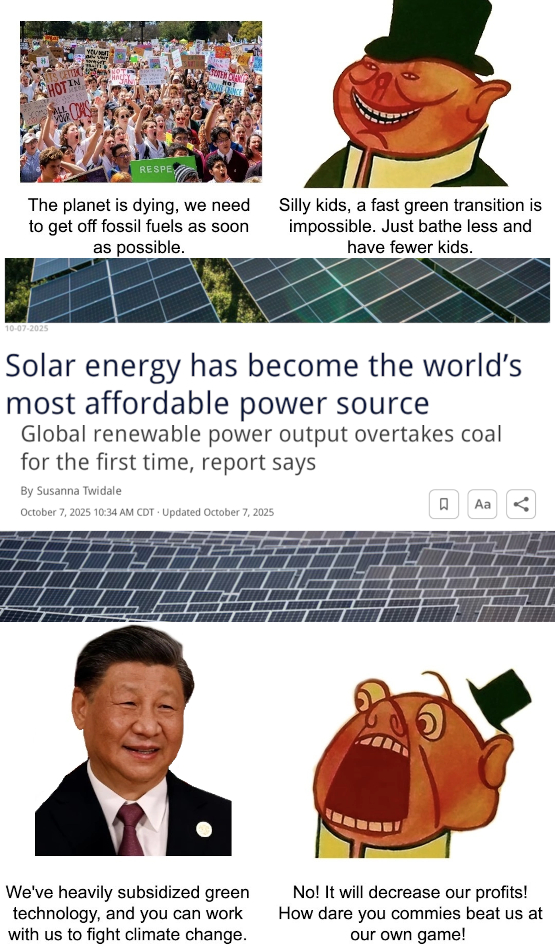 You’re not seriously suggesting that china is any better. They are part of the system. They just recognized that selling solar pannels and stuff to othercountries is very profitable.