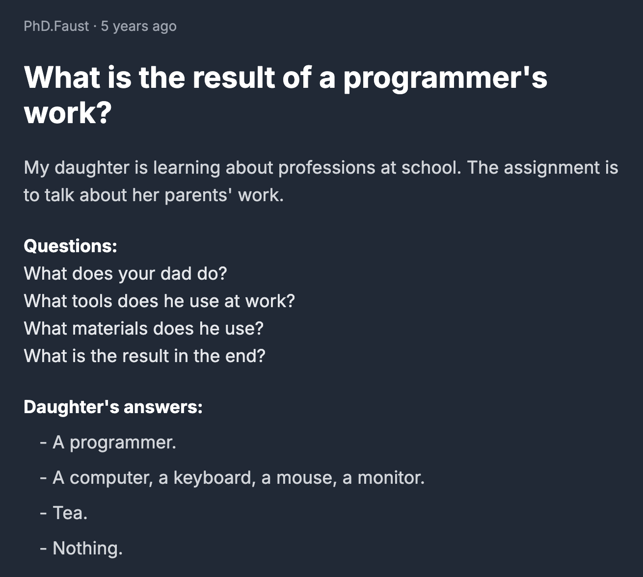 - “My dad does a programmer.” - Perchance the mother is also a programmer