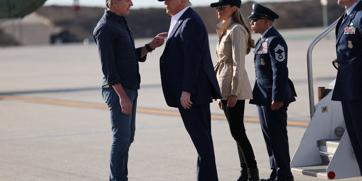 I think they might have vertically aligned to Newsom because there isn’t a good horizon in this photo, and trump is known to stand at an angle. I would have used the light post out of focus in the back, though.