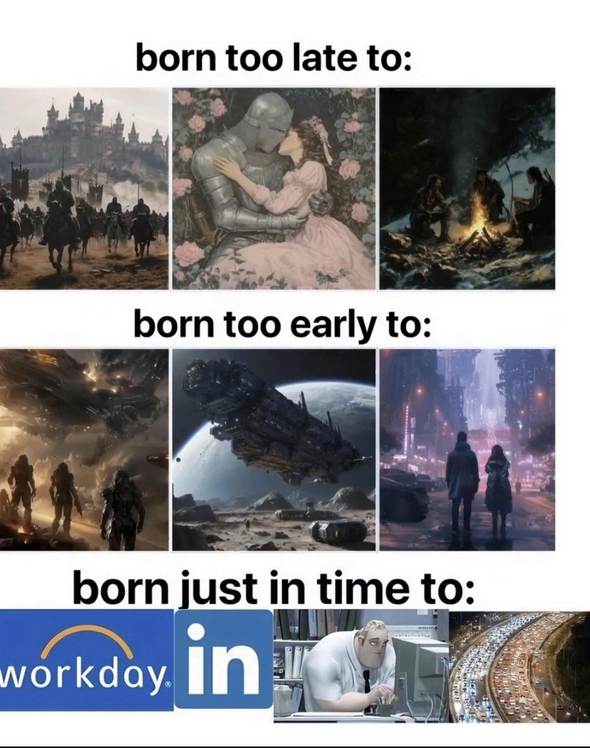 I feel like everyone saying op is glorifying the past and future seems to be missing the fact that this is a shitpost.