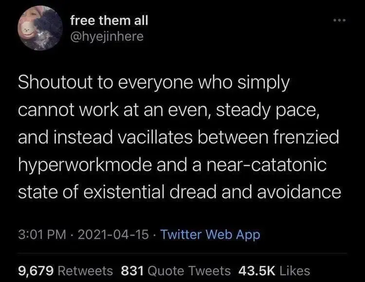 Personal experience: I’m in this meme for “thinking” work. For light physical work, I can work in a steady state for quite some time.