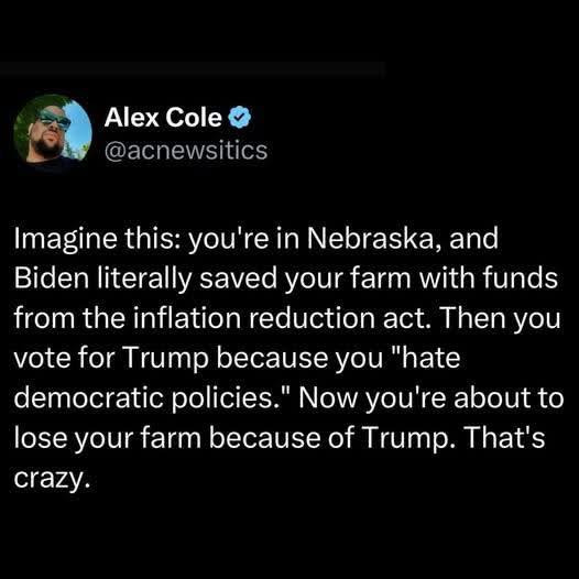 - You forgot the next step. After losing their farm to trumps policies they blame democrats for it. You literally can’t make this shit up. - But before the last step, yo boy DJ Vance’s investment group will buy up the ‘distressed’ farm land for profit. - i wish he’d stuck to bagging groceries.