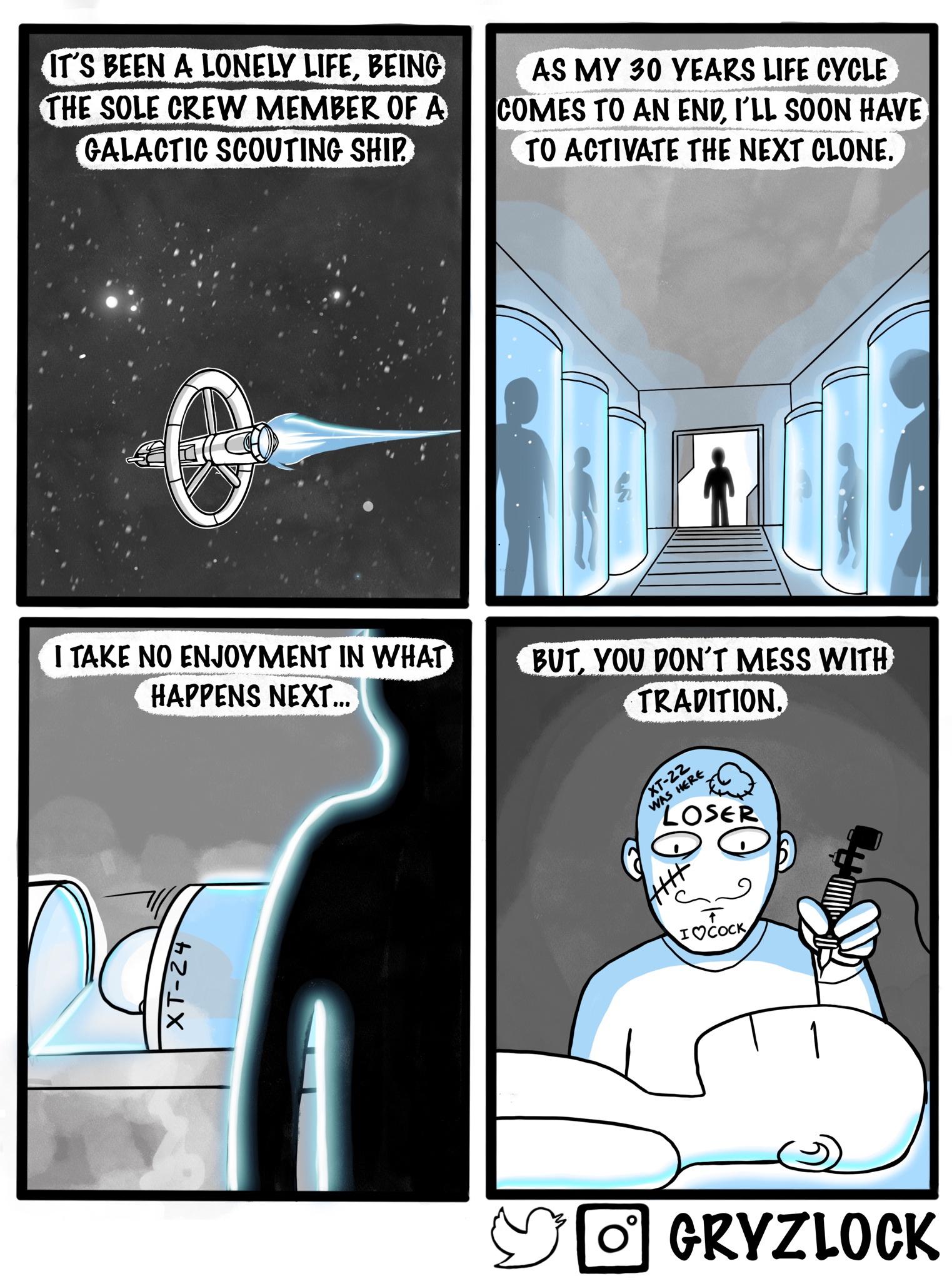 There really should be a squeal to this comic. Does each clone add something to the tattoos? How many clones are ther? What happens when there is no more blank space on the face? What happens when the clones get back with the face tattoos?