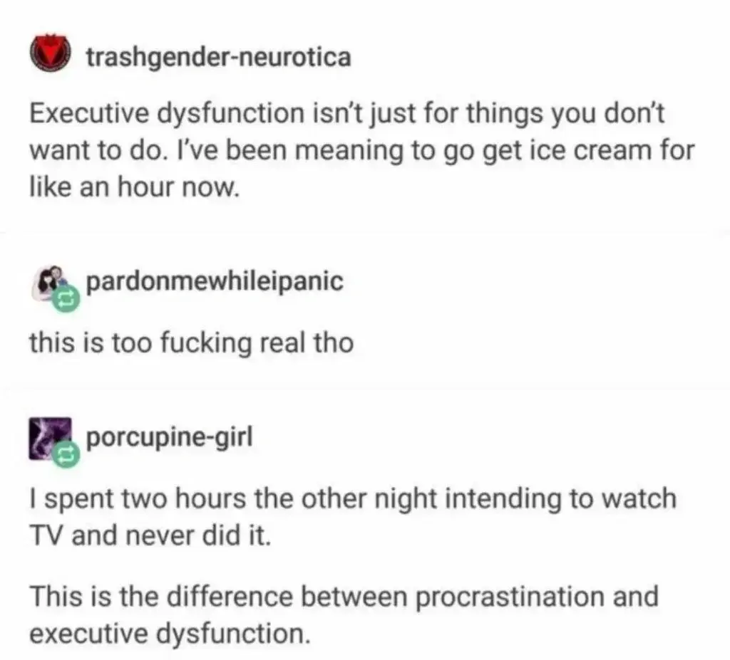This was before I was diagnosed. Anyway point is that you don’t need distraction from a phone to not do a task. The distraction probably does help relieve/distract from the stress of “why tf can’t I do this simple thing” though