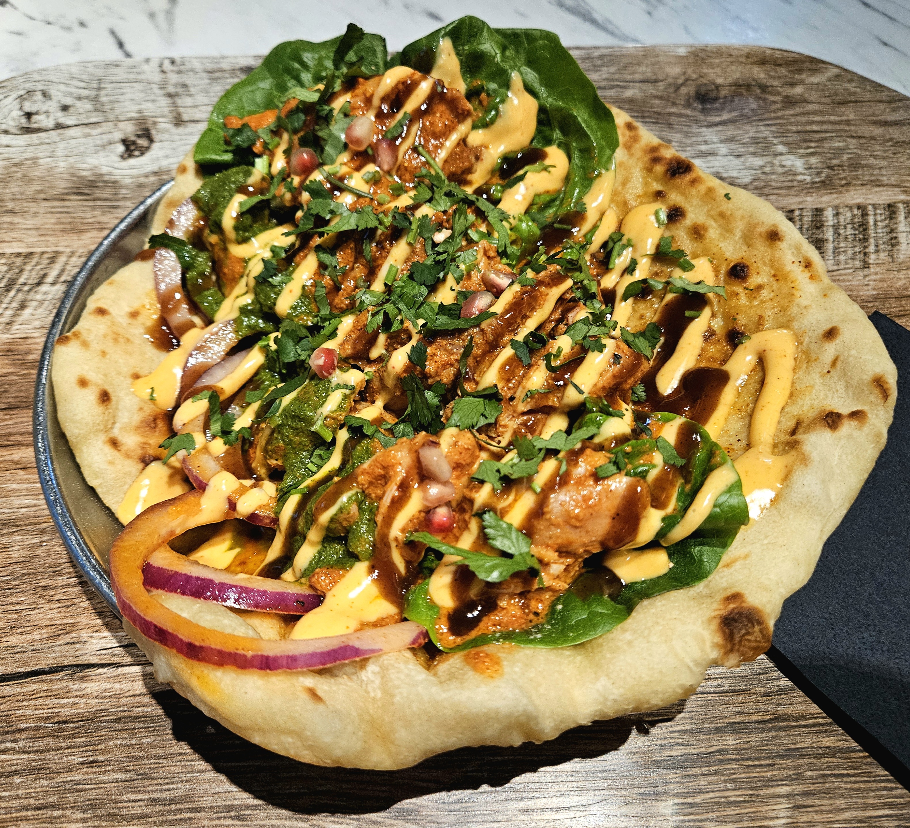 From the Mercato Mayfair in London, Tandoori chicken with red onions, greens, coriander and sauces on a buttered naan.