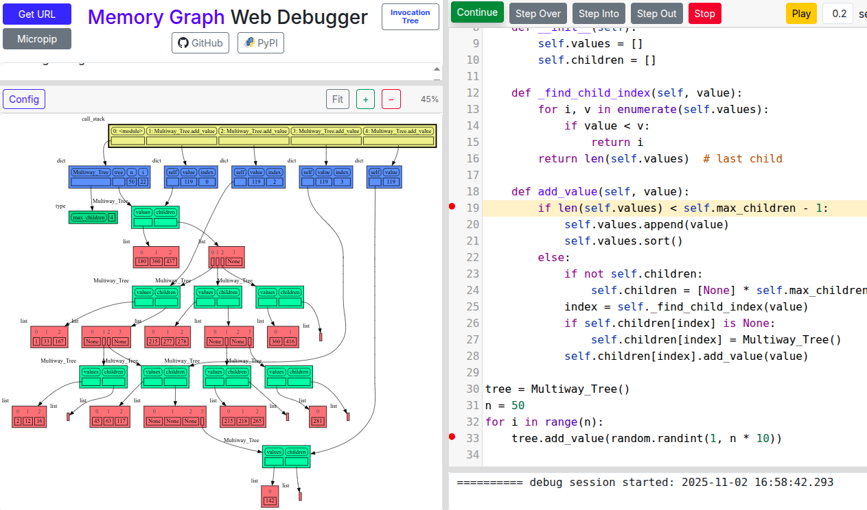 Understanding and debugging Python data structures gets easier with memory_graph visualization. Here’s a Multiway Tree example. A Multiway Tree is similar to a Binary Tree but has an arbitrary number of children making the tree less deep and more efficient.
