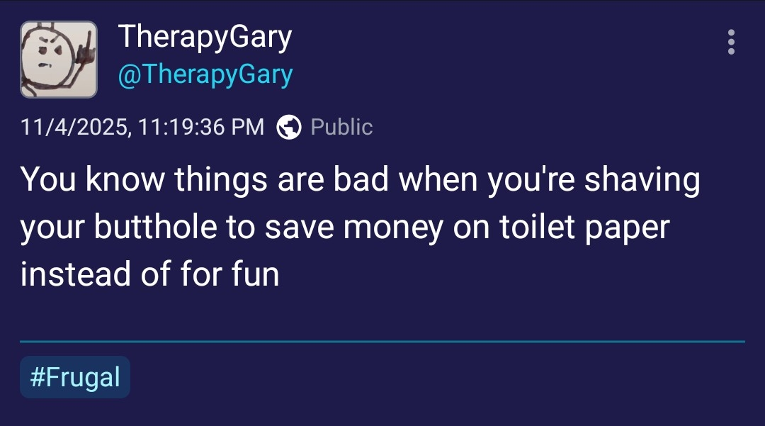 minus-squareKoboldCoterie@pawb.sociallinkfedilinkEnglisharrow-up129·6 days ago why would toilet paper be cheaper if you shave your butthole Imagine wiping peanut butter off of a tile floor vs. wiping it out of a shag carpet.