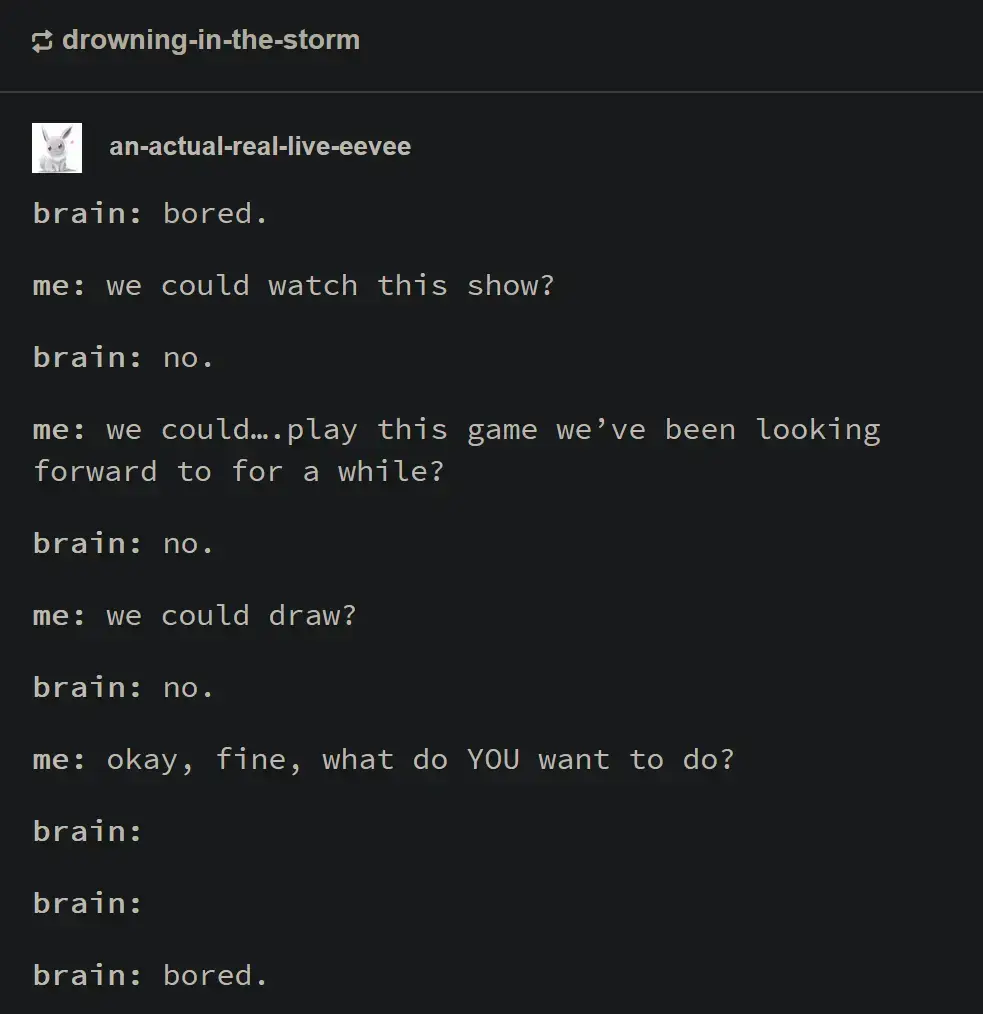 I usually try to just make myself do one of the “boring” things listed (like watch a show or play a game), if it’s so insanely boring that I’d rather do nothing then I’ll stop but even if I don’t find joy out of the activity I initially picked it’ll usually tell me what I do want to do.