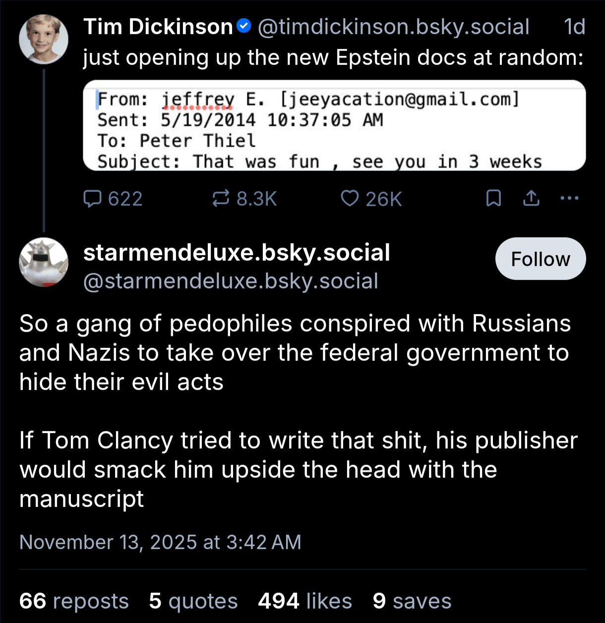 More significantly, he’s one of the key instigators and powers behind the current us government. Explicitly wants to create a technocratic dictatorship.