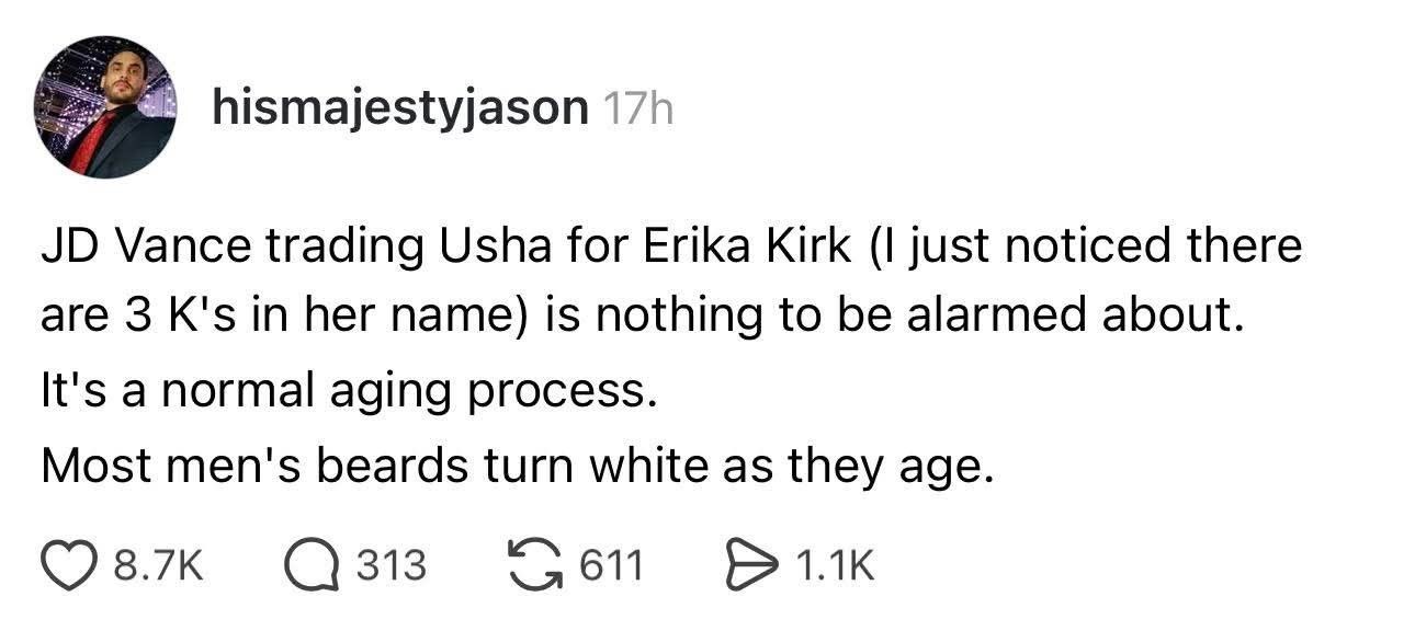 minus-squareNOT_RICK@lemmy.worldlinkfedilinkEnglisharrow-up44·2 days agoNah it’s not a real thing as far as I can tell. Vance and Erika were a bit handsy at one of those weird funeral rallies they’re doing for Charlie but I think that’s the extent of it.
