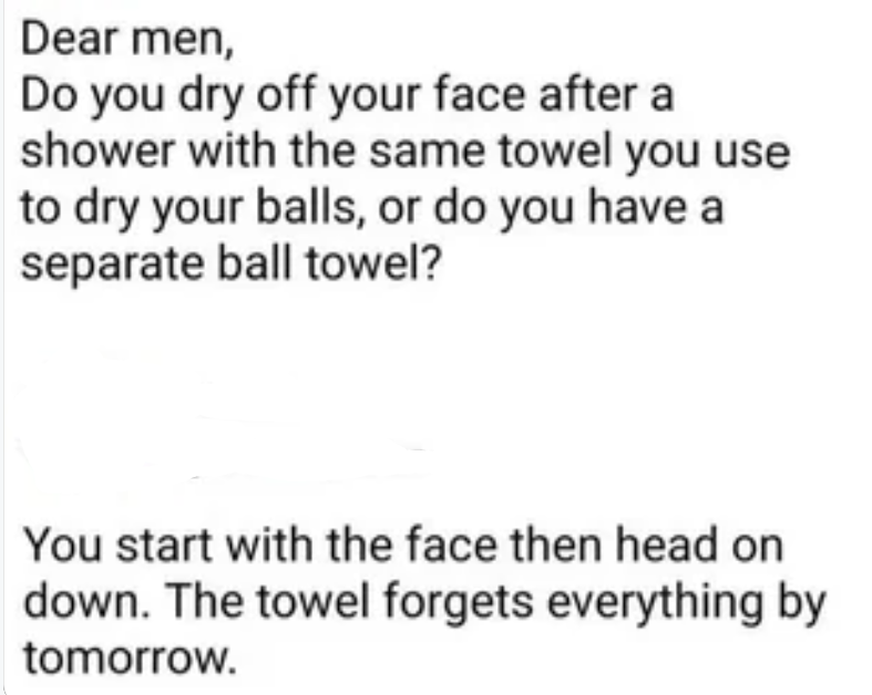 You dry your balls first, then your ass. Then, you get in the shower. After the shower, you use the same towel again to re-apply your musk. Women love it.