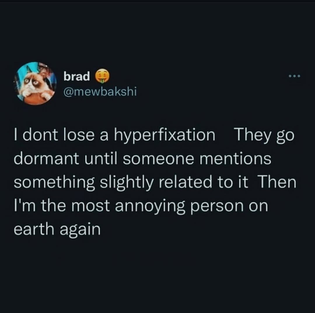 LadyButterfly she/her@piefed.blahaj.zone to Autism@lemmy.worldEnglish · 12 days agoWhat's a good hyperfixation you've had?piefed.cdn.blahaj.zoneimagemessage-square10linkfedilinkarrow-up1271arrow-down15