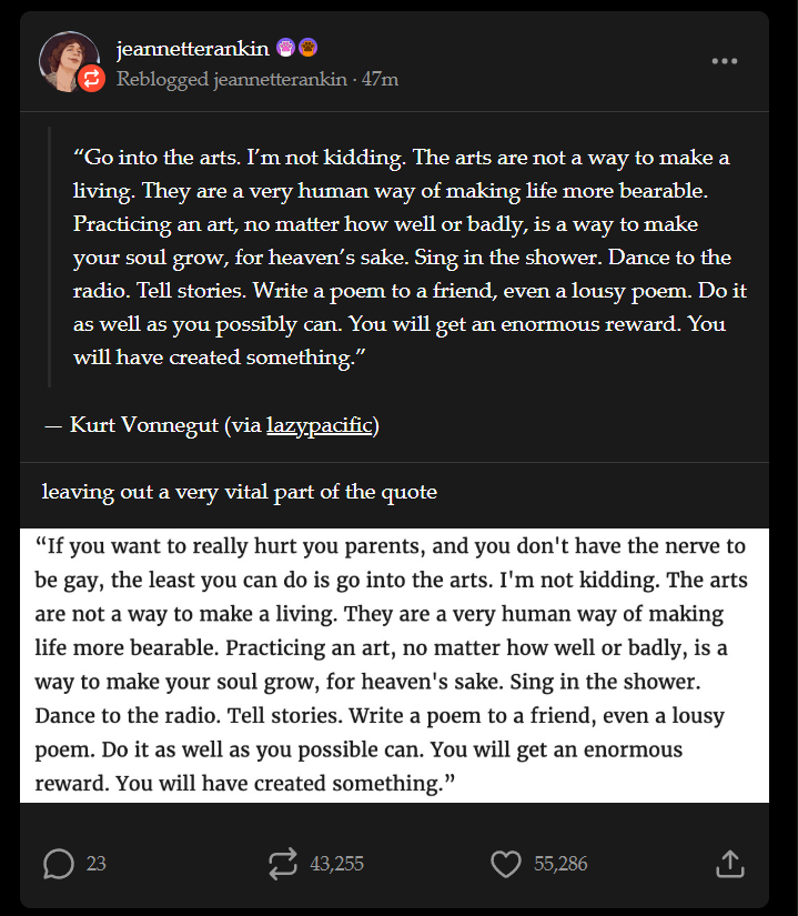 Well that would only be “vital context” if it changed the meaning of the quote whatsoever, which, in the larger context Vonnegut was writing in, it absolutely does not.