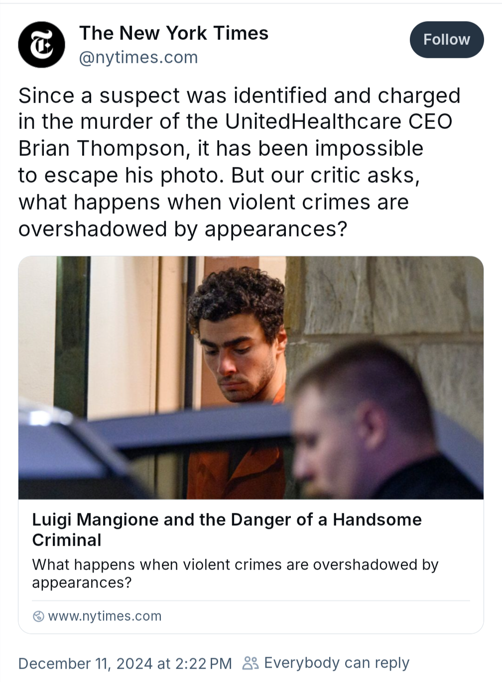 The classic scapegoats aren’t there this time. Can’t blame him being the wrong race, wrong economic class, wrong mentally, wrong physically, or wrong sexually. Now people are actually looking at the issue that caused the “crime” and that’s not good to some people.