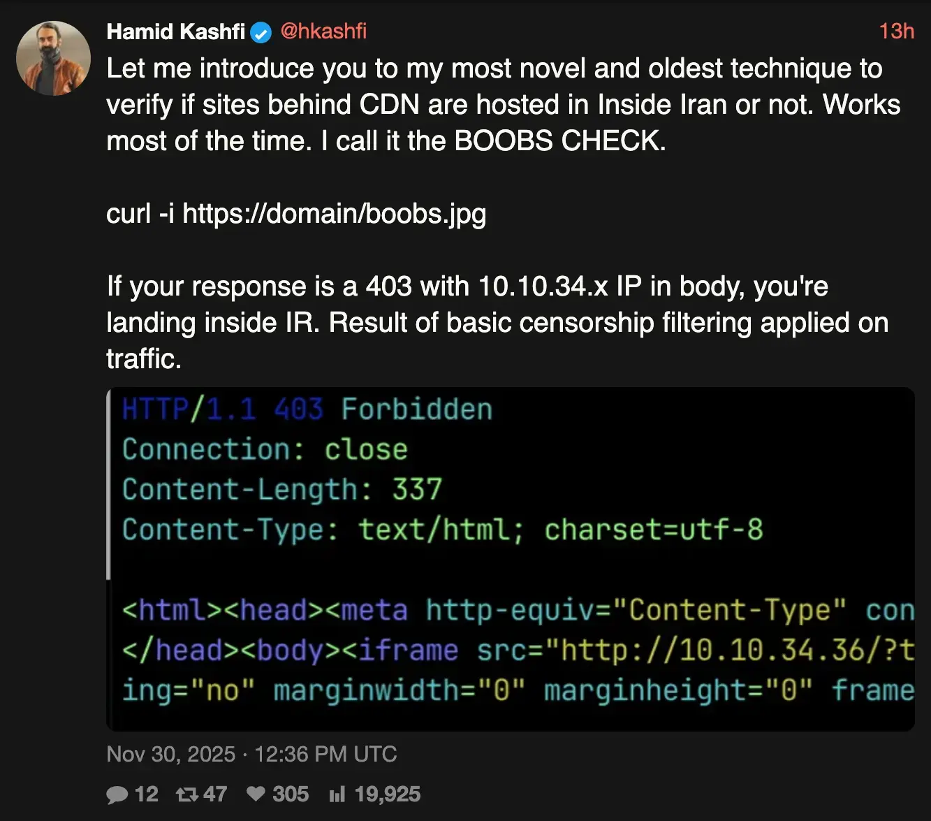 arrow-up1379arrow-down1image"Boobs check" verify if sites behind CDN are hosted in Inside Iran or notlemmus.orgSundray@lemmus.org to Mildly Interesting@lemmy.worldEnglish · 14 days agomessage-square45linkfedilinkfile-text