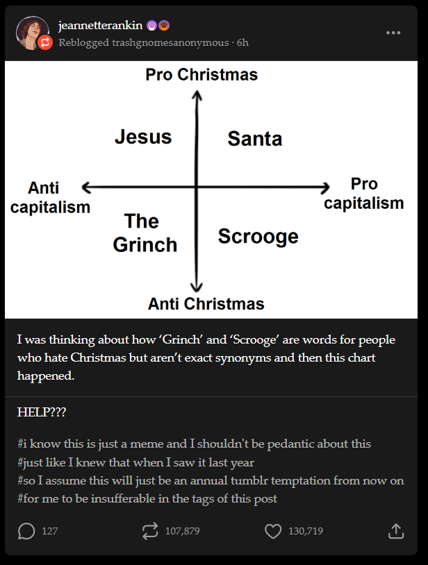 minus-squareWIZARD POPE💫@lemmy.worldlinkfedilinkarrow-up2·1 month agoPro christmas? Maybe not since saint nick is actually 6th of december. Depends on your locale. He punishes bad children (none of pro or against capitalism). I’d put him in the middle actually.