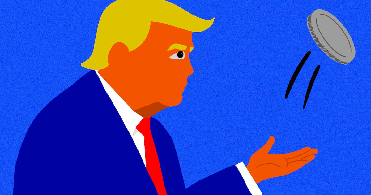 Taking the coin with a pinched left hand, and placing it into the open palm of his right, the president heaved the coin forward, sending it in a feeble, plunging arc. Helpfully, he pointed out where the coin had landed after it hit the ground.