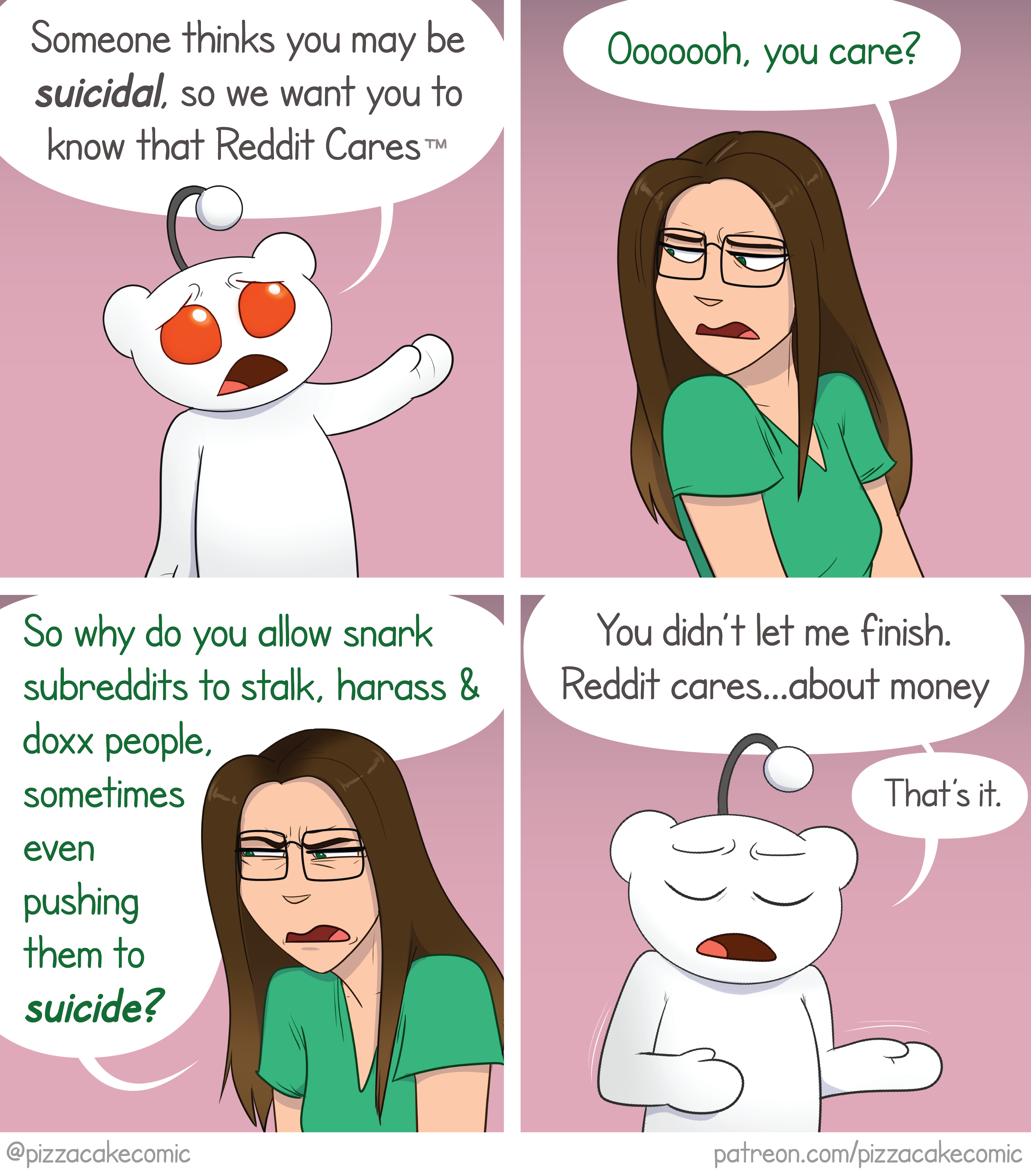 It made me laugh when it was in response to someone getting mad at me after arguing, but occasionally I’d make a highly upvoted comment that was related to being trans or gay and then get them, and that pissed me off. It’s not possible to prove that’s what happened without access to server logs of course, but I for sure wasn’t talking about being depressed or suicidal or anything like that on Reddit, and it was suspicious at minimum.