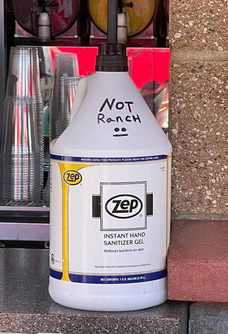 It took a week of people using the bottle as ranch sauce before the owners realized that customers were quietly eating hand sanitizer and complaining about the flavor.