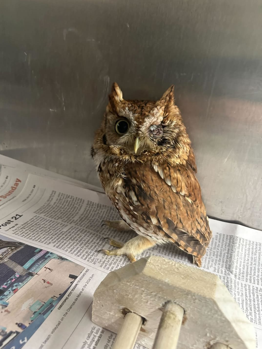 This red-phase Eastern Screech Owl was lucky to survive after being struck by a car and being stuck in the grille for over 12 hours. Despite this traumatic event, the owl came away with no broken bones, but did have an injured left eye that required surgical evisceration (removal of the internal contents of the globe, but preservation of the sclera and surrounding structures).