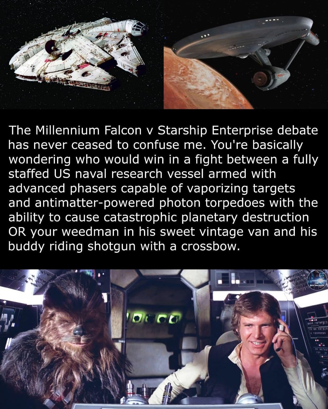 Well the question was “Millennium Falcon vs Enterprise”.