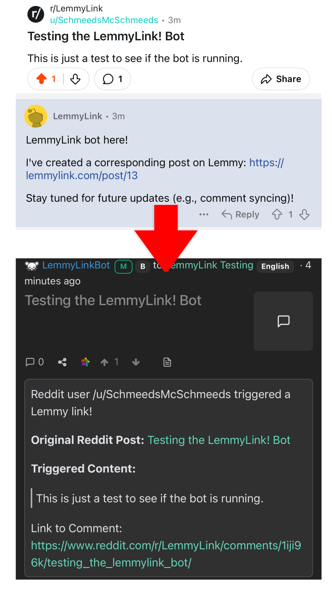 Only works for Subreddits and Lemmy communities specified in the code Reddit users include “LemmyLink!” in their Reddit post or comment LemmyLink posts the Reddit comment or post to Lemmy LemmyLink responds to the Reddit post or comment with link back to the Lemmy post The code is rough so go easy on me but it is available on GitHub: https://github.com/ateames/LemmyLink