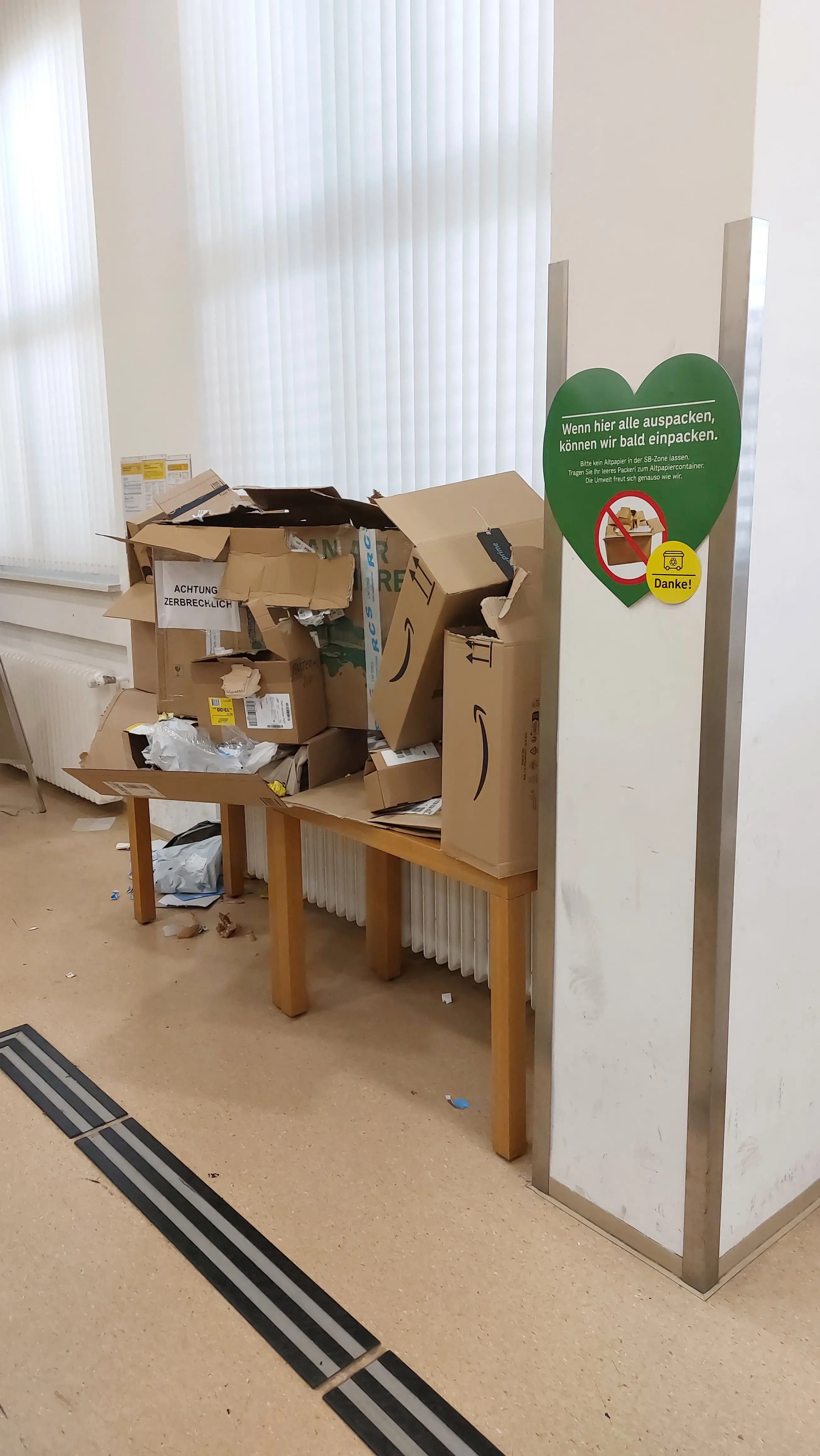 No it doesn’t. It has a bad slogan in big font: “If we all unpack here, we can all pack up” (the idiom probably works if you squint hard enough). Then “Please don’t leave waste paper (carton) in the self-service-zone. Carry your empty package to the container. The environment will be just as happy as us”.