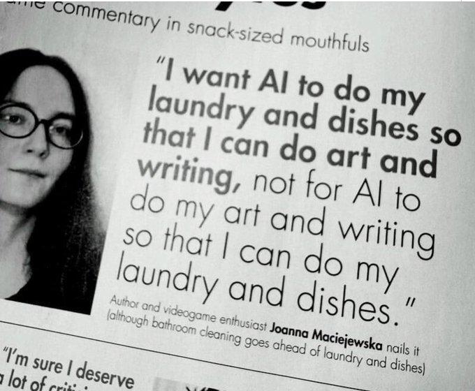 These are bourgoise ideals defended due to artisans fearing their own proleterisation. Why isn’t the quote in defense of AI doing all four things - the dishes and the laundry, and the art and the writing? Why not socialise the unpaid labour? There’s an inherent patriarchy here as well.