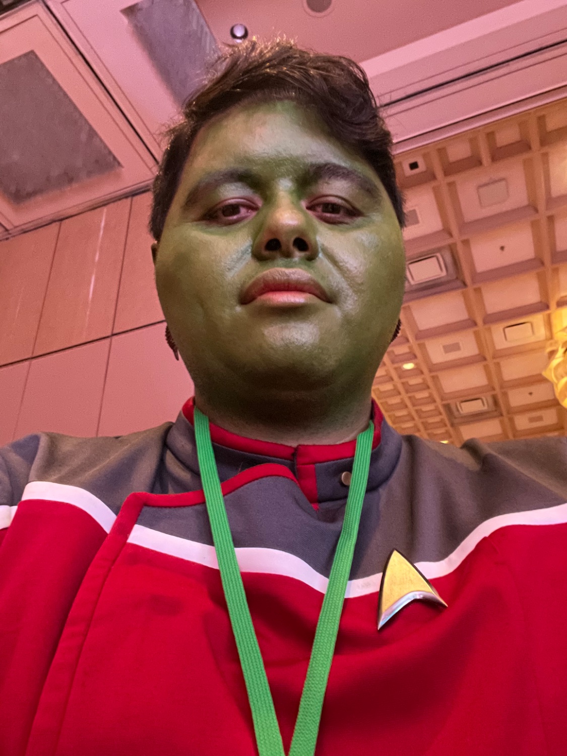 Garrett also loved my EHK; asked for a photo of me and a video explaining it. So all I did was dress up in the early 2370s uniform, wear an ensign pip and slap a mobile emitter (Fansets released a new mobile emitter at STLV which was super popular). Emergency Harry Kim: activate when you need an ensign to disappoint. Ironically the Starfleet Academy trailer had been released two weeks earlier.
